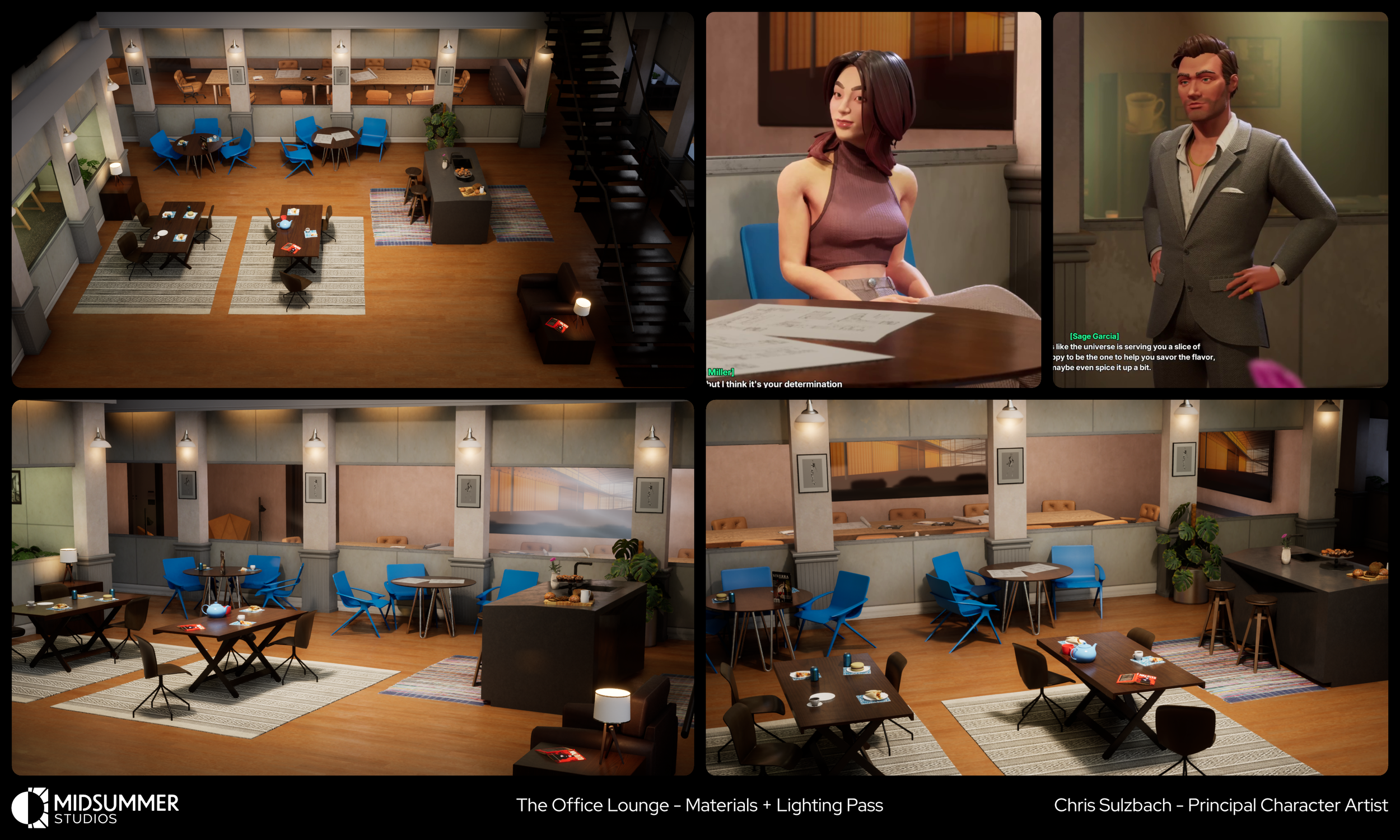 For the Office Lounge, I conducted a full lighting pass as well as a materials polish pass including the creation of a new glass shader. I also did the procedural cinematic lighting setups.