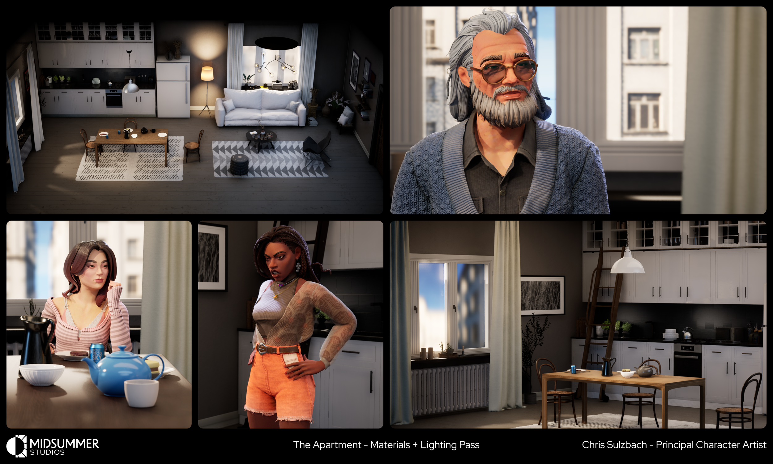 For the Apartment, I conducted a full lighting pass as well as a materials polish pass including the creation of a window shader. I also did the procedural cinematic lighting setups.