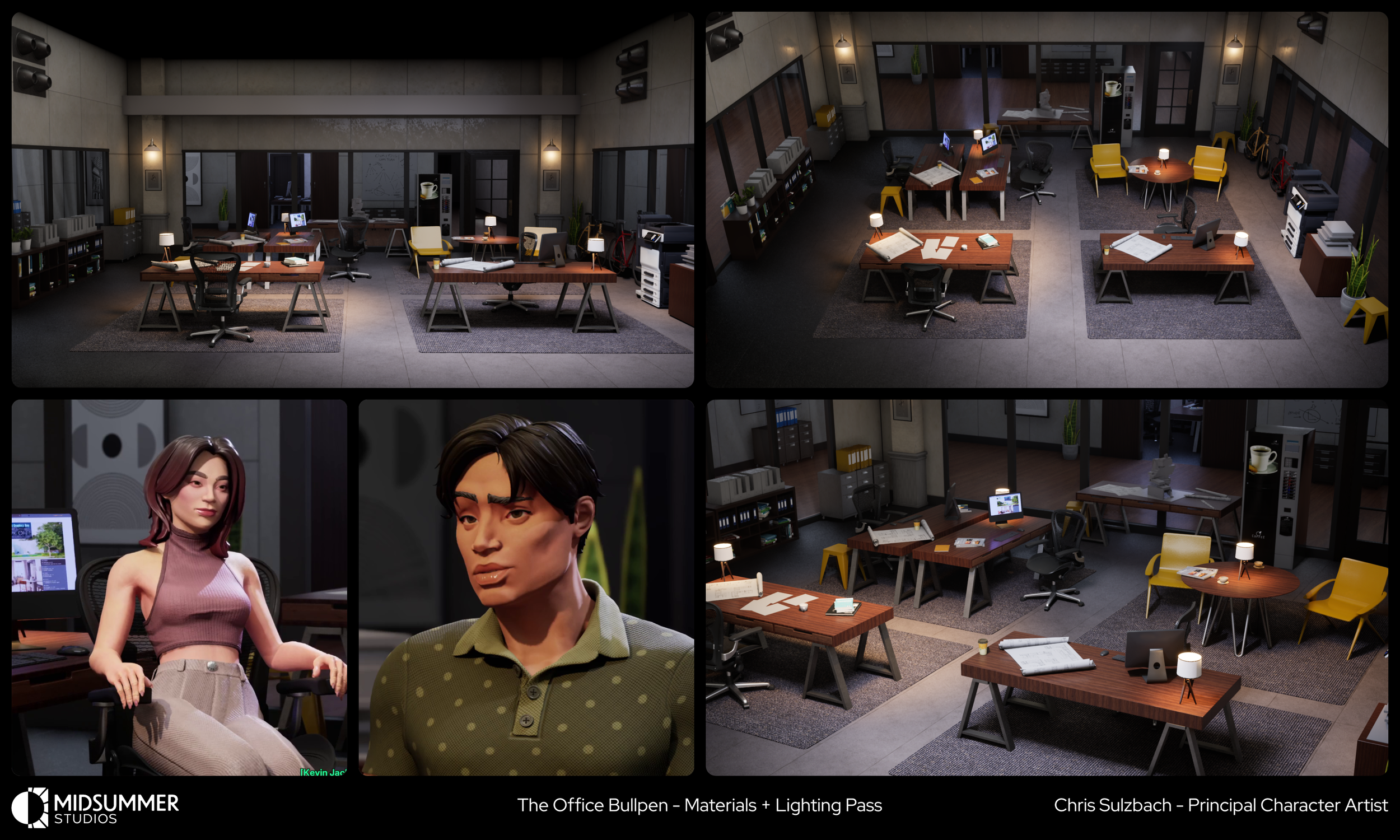 For the Office Bullpen, I conducted a full lighting pass as well as a materials polish pass including the creation of a new glass shader. I also did the procedural cinematic lighting setups.